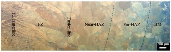 According to the different heat input energy of each zone, the weld joint can be divided into three zones (Figure 5): fusion zone (FZ), heat affected zone (HAZ), and base material (BM). Further, the HAZ can be divided into Near-HAZ and Far-HAZ, based on its distance from the centerline of FZ. During the solidification of the welding process, coarse columnar β grains were formed and their growth direction was perpendicular to the welding pool surface [,]. The thermal input for HAZ and BM was low. Therefore, the microstructure of HAZ and BM exhibited equiaxed grains.
