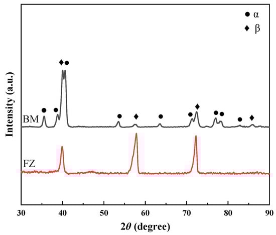 The results of XRD proved that only β characteristic peaks could be observed in the FZ compared with the BM in Figure 6, Since the high heat input energy in the FZ, the α to β transformation took place in the FZ. During the cooling process, the transformation of β to α was completely suppressed in the FZ due to the presence of β-stabilizing elements such as Mo and V and the fast cooling rate []. Therefore, only β characteristic peaks could be observed in the FZ.