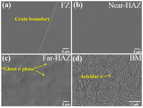 Figure 7b reveals the same single β phase in the Near-HAZ, indicating that the temperature in the Near-HAZ is higher than β-transus and lower than the solidification temperature. Figure 7c shows the size and distribution of the α phase in the Far-HAZ, which is called the “Ghost α phase” []. Compared with the microstructure of the BM (Figure 7d), there is a significant reduction in the volume fraction of the α phase in the Far-HAZ. Furthermore, part of the α phase was not completely dissolved, which remained, in short, rod-shaped. Due to the temperature gradients during the welding, the temperature gradually decreased from the center line to the BM. Thus, there was not sufficient time or temperature for the α phase to completely transform to the β phase and eventually formed the “Ghost α phase” in the Far-HAZ.