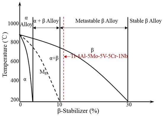 Figure 7 compared the microstructure among different zones of the as-welded joint. It can be observed that their microstructure was different greatly. The acicular α in as-welded FZ vanished completely after the process of high temperature and rapid cooling, and only the columnar grains of the β phase were formed in Figure 7a. During the welding process, the temperature of FZ rapidly exceeds the β-transus, which is sufficient for the transformation of α to β. The stability of β phase is positively related to the molybdenum equivalent (Moeq = 1.00 Mo + 0.67 V + 0.44 W + 0.28 Nb + 0.22 Ta + 2.90 Fe + 1.6 Cr + 1.25 Ni + 1.70 Mn + 1.70 Co − 1.00 Al, wt.%) []. The phase diagram of titanium alloys is shown in Figure 8. When Moeq value exceeds 10 wt.%, the transformation of β to the α’ martensitic is completely suppressed when it is rapidly cooled from a temperature above the β-transus []. The Moeq value for Ti-45551 alloy is 12.63 wt.%. Therefore, there should be no martensite precipitated in the FZ during the rapid cooling stage.