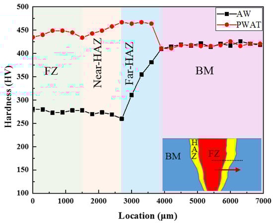 (3) The microhardness of the weldment presented a nonuniform distribution. In AW condition, there is a minimum microhardness in FZ and Near-HAZ, and the microhardness increased gradually to that of BM. PWAT led to a significant increase in the value of microhardness in FZ and HAZ. The microhardness of the Far-HAZ is the highest, reaching about 463 HV, and the microhardness of the FZ and the Near-HAZ is about 445 HV. While for the BM, the microhardness had barely changed.