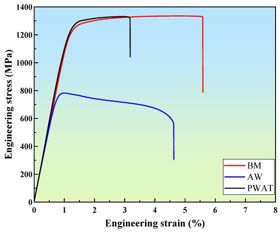 Figure 11 shows the engineering stress–strain curves of different joints under ambient temperature, and the corresponding properties are summarized in Table 2. Tensile behavior significantly varies with the sample conditions. The yield strength and fracture elongation of the BM are 1250 MPa and 5.6%, respectively. However, the AW sample displays a poor yield strength and ductility of 778 MPa and 4.6%, respectively. The decreased yield strength in the AW condition can be attributed to the transformation of α to β in the FZ and HAZ during the EBW process. Thus, a “soft zone” (Figure 10) was formed in the FZ and HAZ, leading to a decrease in strength and ductility. By observing the fractured AW tensile samples, plastic deformation mainly occurred in the FZ and HAZ, and the final fracture location was in the FZ. However, the strength of the weld joint is significantly improved by aging treatment, which is similar to that of the base metal, which can be attributed to the fine and dispersed αs precipitation in the FZ and HAZ. The ductility of the PWAT joint is reduced to 3.1% and the final fracture location is in the FZ. It is most likely the coarse columnar grains in the FZ are difficult to sustain plastic deformation during loading, resulting in the initiation of cracks and propagation along these boundaries [,,].