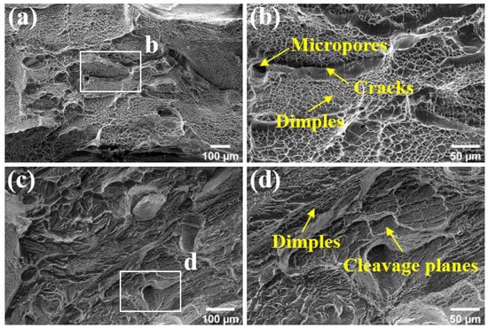 Tensile fracture morphology of both AW and PWAT joints is displayed in Figure 12. No welding porosity was observed in all fracture surfaces of tensile samples. There are a large number of dimples on the fracture surface in Figure 12a,b, which demonstrates the ductile fracture mode in AW samples. In addition, many micropores emerged among the dimples, and some cracks were generated with the coalescence of the micropores. After PWAT, the number of dimples decreased and some cleavage planes can be observed on the fracture surface in Figure 12c, which agree with the elongation reduction after PWAT. The localized dimples and cleavage planes on the fracture surface in Figure 12c,d indicate a mixed mode of PWAT samples.
