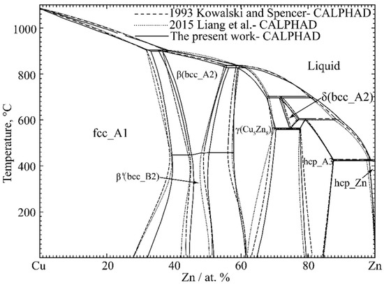 The present calculated phase diagram of the Cu-Zn system, compared with the original experimental data from Bauer and Hansen [36], Ruer and Kremers [37] and Parameswaran and Healy [58], is shown in Figure 1. Based on previous experimental results [36], Ruer and Kremers [37] re-investigated the Cu-Zn system using the thermal analysis method. The liquidus data provided by Parameswaran and Healy [58] using the calorimetry method showed a slight difference with [37], especially in the Zn-rich region. Miodownik [43] critically reviewed the experimental phase diagram of the Cu-Zn binary system, omitting the EMF results provided by David et al. [47]. Figure 1 represents the calculated phase diagram in this work together with the results of [43]. The calculated liquidus curve, located between the illustrations of [37] and [58], fit well with the invariant reaction temperatures of the assessed phase diagram [43], as shown in Figure 1. In addition, the limited thermodynamic information for the boundaries of these phases, fcc_A1, β′ (bcc_B2), γ (Cu5Zn8) and hcp_A3, at the temperature below about 400 °C, illustrated by Hansen and Anderko [41], represented an uncertainty. This is because the present broad-scale optimization work resulted in minor differences from the previously calculated results [45,50].