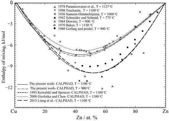 The enthalpies of the mixing of liquid Cu-Zn alloys, , at 1127 °C [58] and 1100 °C [59] were directly measured by the calorimetry method. The results obtained by Parameswaran [58] when xZn > 0.5 showed a large deviation. Samson-Himmelstjema [60] calculated the liquid properties at 1000 °C based on their measured enthalpy values of the solid phases at 20 °C. There were significant discrepancies between the different results.