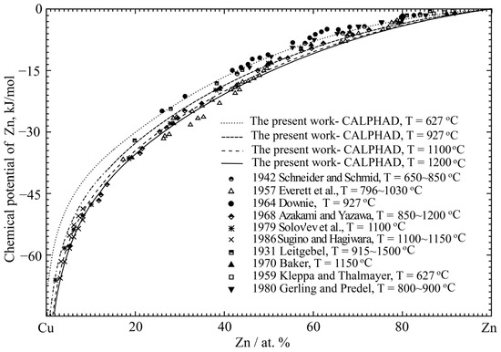 The present calculated values of the relative chemical potential of Zn in the liquid phase at 627, 927, 1100 and 1200 °C reproduced the experimental results [61,62,63,64,65,66,67,68,69,70] very closely, as shown in Figure 4. The relative chemical potential of Zn in the liquid was calculated at different temperatures to compare the different experimental results, which varied only a little in the wide temperature range from 627 °C to 1200 °C.