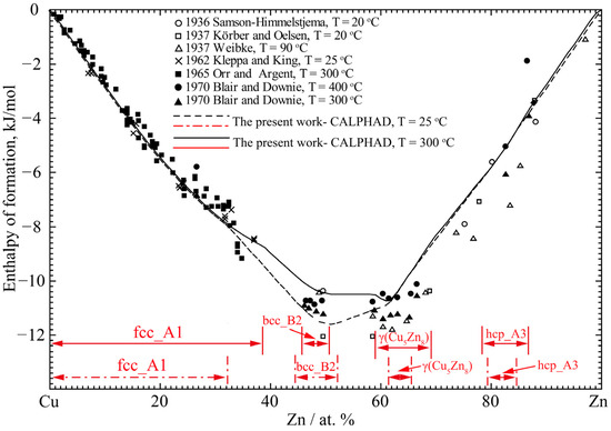 The enthalpies of the formation of the solid fcc_A1 phases were measured by calorimetric investigations by Samson-Himmelstjerna [60] (20 °C), Körber and Oelsen [71] (25 °C), Weibke [72] (90 °C), Kleppa and King [73] (25 °C), Orr and Argent [74] (300 °C) and Blair and Downie [75] (300–400 °C). The enthalpies of the formation of the β’ (bcc_B2), γ (Cu5Zn8) and hcp_A3 phases were measured by the calorimetry method as well [60,71,72,75]. Because it is challenging to attain equilibrium in the specimens used for calorimetric measurements at room temperature, the experimental data on the homogeneity range were doubtful for the ordered β’ (bcc_B2) phase and γ (Cu5Zn8) phase.