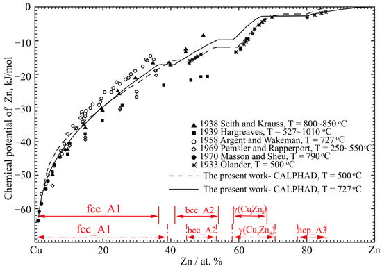 The calculated chemical potential of Zn for the solid phases at 500 and 727 °C in the Cu-Zn system compared with the experimental data from refs. [76,77,78,79,80,81].