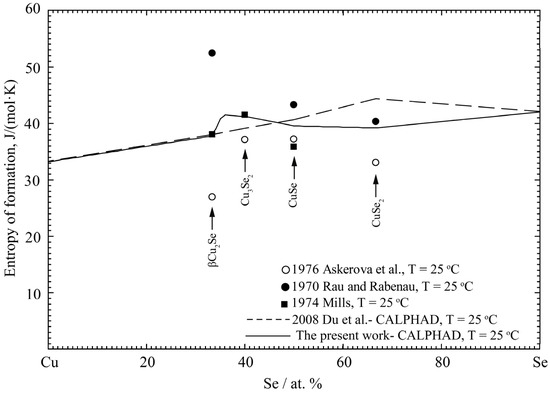 Gattow and Schneidener [92], Askerova et al. [93] and Rau and Rabenau [94] measured the enthalpies of the formation of the compounds α-Cu2Se, β-Cu2−xSe, α-CuSe, Cu3Se2 and CuSe2 at 298.15 K by the calorimetry method, the EMF method and vapor pressure method. Mills et al. [95] evaluated the data based on the previous experimental results. For β-Cu2−xSe, the enthalpies of formation were estimated in by [94]. Their results were a little scattered, whereas the data evaluated by Mills et al. [95] were reasonable to some extent. The standard entropies of the compounds CuSe2, CuSe, Cu3Se2 and Cu2Se at 298.15K were reported by Askerova et al. [93], Rau and Rabenau [94] and Mills [95] as well.