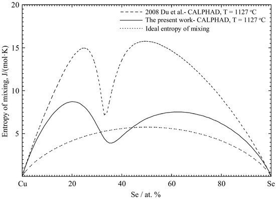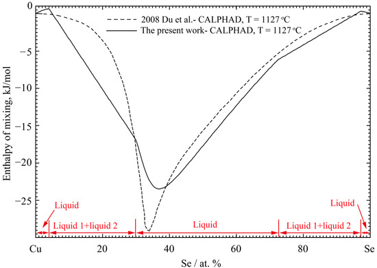 For the liquid phase, the activities of Cu and Se at 1100 °C were determined by Blachnik and Bolte [100]. Askerova and Yazawa [101] calculated the activities of Cu and Se at 1200 °C and 1150 °C by the Gibbs–Duhem integration. These were difficult to illustrate in the figure because of their very small value. The original experimental results of the thermodynamic properties of the different Cu-Se compounds are presented in Table 2.