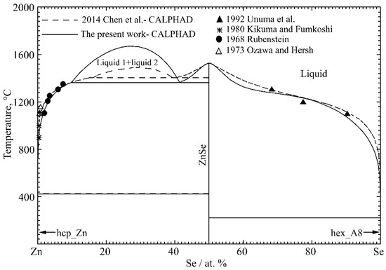 The liquidus data of the whole Zn-Se binary system have been less rigorously studied. It was determined by [108,109,110,111] only over the range of 0–9 at.% Se, and 68–90 at.% Se and 99–100 at.% Se by [112,113]. The liquid miscibility gap and the monotectic reaction in the Zn-ZnSe region were predicted by Sharma and Chang [101] and compared to the similar liquid miscibility gap in the Zn-Te system [114]. In the present study, both the experimental results and calculated results by Sharma and Chang [101] were considered.