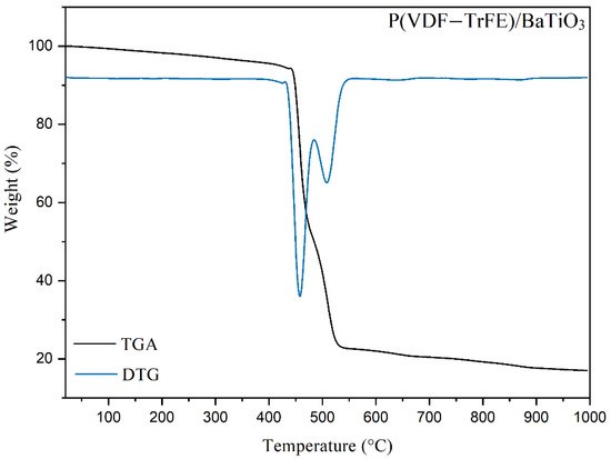 61]. Analyzing the derivative thermogravimetric curve (DTG) it is possible to identify events that are not seen by analyzing only the thermogram curve. The reaction reaches its maximum rate at 450 °C, and at 550 °C it is possible to observe a second lower intensity peak, indicating another weight loss process of the composite. The first DTG peak is assigned to the degradation of vinylidene fluoride, while the second peak is related to the degradation of trifluorethylene, since the mass loss (67.5%) at 450 °C is higher than the mass loss (≈33%) at 550 °C, reflecting the molar composition of the copolymer—VDF 80 mol% and TrFE 20% mol.