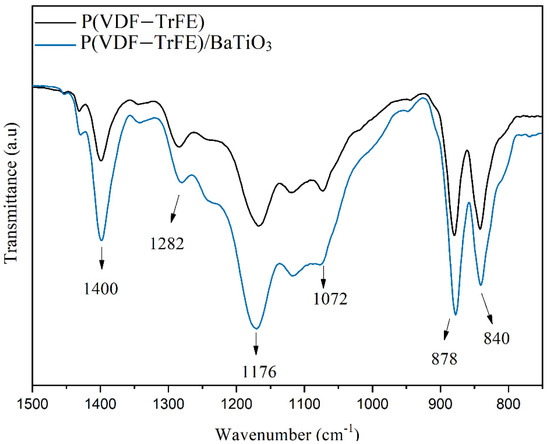 The spectra obtained through the FTIR technique were assigned to the crystalline phases of the P(VDF-TrFE)/BaTiO