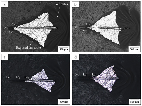 48] have found in their studies that the relation between the surface roughness and the coating adhesion on a substrate refers to the increase in surface area. In other words, the surface roughness influences the interface between the substrate and the deposited film, improving the adhesion strength between both of them. Besides, the adhesion strength on rough surfaces may be adequate due to the high surface energy of atoms present on the scratched surface [