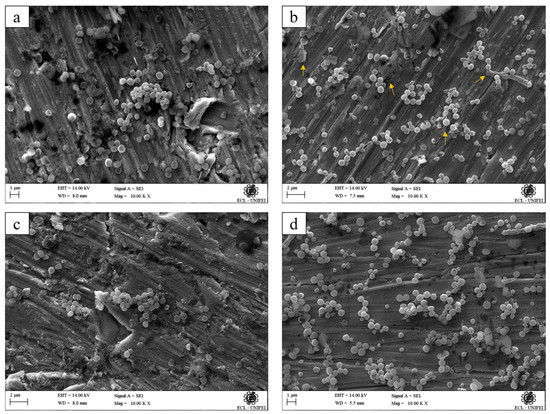 48]. The adhesion of thin films on metallic substrates occurs when the surface presents pores, scratches, voids, and cracks, which allows for film penetration and, consequently, a mechanical fixation at the interface of these materials [
