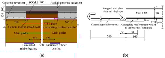 During installation, a certain space was maintained between the SCC-LS and the beam body of the simply supported bridge, so that the beam end could be warped up, thus avoiding a negative bending moment on the concrete of the link slab. A smooth top Teflon plate was set under the steel plate, so that the steel plate could slide longitudinally on it and effectively release the stress generated at the beam end. By setting the separation joint composed of an oil-soaked softwood strip and a stainless-steel plate, the deck pavement concrete was completely separated from the deck concrete, so that the tensile stress caused by the deformation of the bridge was transmitted by the connecting reinforcement, avoiding damage in the deck concrete.