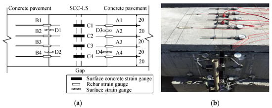 Layout of the measuring points and instrumentation. (a) Strain gauges mounted on the individual rebars and surface strain gauges on top of the link slab. (b) Details of the instrumentation layout after installation.