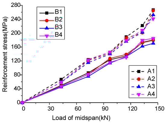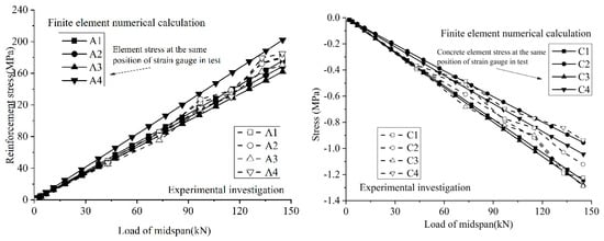 Figure 9 shows the comparison between the test and the finite element model results for the SCC-LS under various loads. It can be observed that the compressive stress on the surface concrete and the tensile stress on the reinforcement gradually increased with the increase of the concentrated force at the midspan, which proved that the finite element model could accurately simulate the structural behavior of concrete and steel.