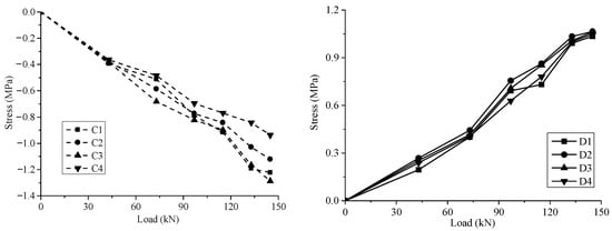 Figure 6 shows the load–stress curve of the measuring point close to the welding point between the connecting reinforcement and the steel plate. The maximum stress of the connecting reinforcement could reach 273.98 MPa, which indicated that the stress was transferred to the connecting reinforcement of the SCC-LS. Due to the large stiffness of the steel–concrete composite section, the overall stress decreased and did not exceed the ultimate tensile strain of the concrete.