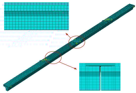 A finite element model of the SCC-LS was established by ABAQUS (Version: 6.14-4; Name and location of manufacturer: Dassault Systemes located in Johnston, Rhode Island, USA) The concrete short T-girder, Teflon plate, loading block, link slab steel plate, link slab T-rib and bridge pavement were simulated using an eight-node linear reduced integral hexahedral solid element (C3D8R), and the ordinary reinforcement and prestressed reinforcement were simulated using a three-dimensional truss element (T3D2). The minimum mesh size of the finite element model was 0.03, including 31,242 solid elements and 160 truss elements, as shown in Figure 8.