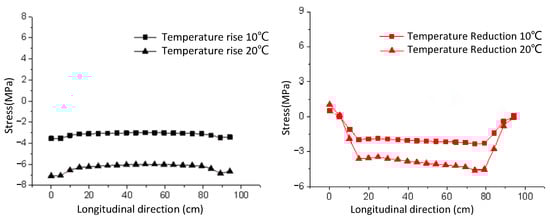 The environmental temperature has a great influence on the longitudinal horizontal deformation of a bridge. In order to analyze the stress change on the SCC-LS in relation to the temperature, the temperature effects on the link slab model were determined in the finite element simulation. The calculation results are shown in Figure 11. It can be seen that the concrete top surface of the SCC-LS was basically subject to compressive stress, that is, changes in the temperature had no adverse effects on the link slab.