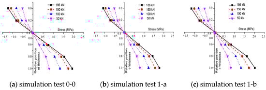 We extracted the stress data of the SCC-LS along the thickness direction, as shown in Figure 12. In the finite element simulation, for SCC-LS of three spans, the neutral axis was always located at the position 40% of the thickness from the upper surface, and the tensile and compressive stress up and down the neutral axis increased with the increase of load. The neutral position remained unchanged, its deformation was always elastic, and the SCC-LS showed no cracks in the stress stage.