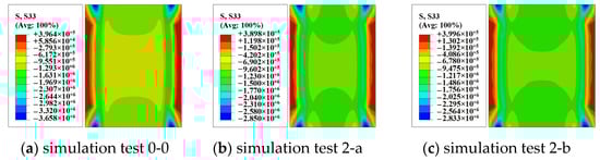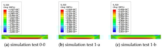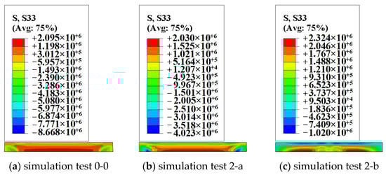 We obtained the S33 stress nephogram of the deck with three spans along the thickness direction, as shown in Figure 13. It can be observed that compared with the simulation tests 0-0 and 1-a, the tensile stress at the bottom of the SCC-LS in the simulation test 1-b was larger, reaching 2.02 MPa (not exceeding the standard value of the ultimate tensile strength of C35 concrete of 2.39 MPa, but close to it). The max compressive stress (2.85 MPa, 2.83 MPa) of the SCC-LS in the simulation test 1-a and simulation test 1-B was 22.1% and 22.7% less, respectively, than that of the simulation test 0-0 (3.66 MPa). It can be inferred that the crack prevention performance was better when the length of the link slab was equal to the distance between the bearing centerlines at the adjacent ends of the beam.