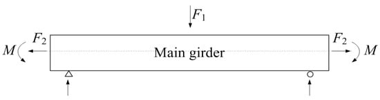When the concentrated load F1 is applied on a T-shaped beam rib span, translate the force F2 to the neutral axis of the beam rib to obtain the concentrated load F2 and the additional eccentric moment M []. The basic stress model is shown in Figure 18.