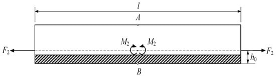 The model diagram shown in Figure 19 can be regarded as the stress model diagram of an eccentric tension beam. The effect of an eccentric tension F2 on the deck can be equivalent to the superposition of axial tension and pure bending members []. The equivalent bending moment is M2 = F2h0.