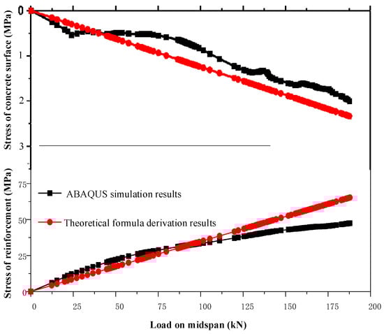 According to the above theoretical formula and ABAQUS finite element simulation, the stress on the connecting reinforcement in the simulation test 0-0 and the compressive stress on the concrete surface were calculated and displayed in a graph, as shown in Figure 20. It can be seen from the graph that the theoretical derivation formula was in good agreement with the finite element results. The SCC-LS theoretical analysis formula proposed in this paper can effectively calculate the stress on the link slab and accurately and intuitively distinguish the primary and secondary relations of various functions, providing a basis for the prevention and control of disfunctions of the link slab. The theoretical results show that this structure can effectively avoid the warping effect and reduce the tensile stress of the surface. The theoretical results are consistent with those of Gergess et al. [] and Wang et al. [,].