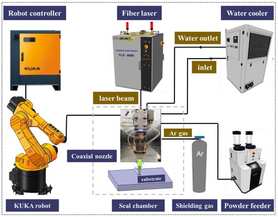 During the laser cladding process, FeCoCrxNiAl HEA with different Cr element contents are laser melted on the base metal, heat-affected zone and weld bead of Q345 low-alloy steel welded joints, respectively, by a set of unchanged process parameters. The irradiation of the laser beam causes the material at the center of the beam to be subjected to high temperature and the molten pool is generated. At the same time, the HEA powder is sent to the molten region through the powder feeding nozzle under the restriction of the powder carrier gas. As the laser beam moves, the cooling metal at the rear side of the molten pool solidifies rapidly, and then a new molten pool is formed at the horizontal center of the laser beam in front of the molten pool. The formation and solidification of the molten pool continue until a complete cladding coating is formed. The laser cladding equipment is illustrated in Figure 2, including YLS-6000 fiber laser (Han’s Laser Technology Industry Group Co., Ltd., Shenzhen, China) capable of achieving a power of 6 kW, KUKA six-axis linkage robot, CCT-3300 water cooler, powder feeder, controller, shielding gas and seal chamber. In order to prevent oxidation during the experiment, a Rapid ox 1100 oxygen analyzer (Cambridge Sensotec, Cambridge, UK) is used to monitor the oxygen content in the seal chamber in real time. The specific process parameters are illustrated in Table 3, which are obtained from the reference to the parameters in other literature [35] and simple multiple pre-tests.