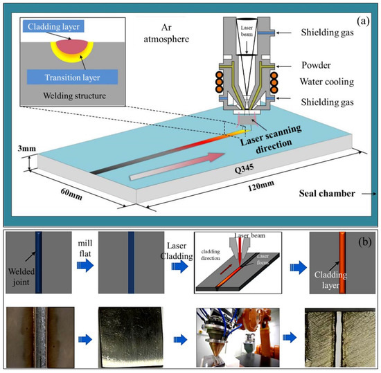 Schematic diagram and experiment processes. (a) Schematic diagram of laser cladding; (b) specific experimental processes.