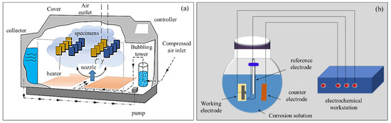 The working principle of corrosion resistance tests. (a) Working principle of salt spray test chamber; (b) schematic diagram of electrochemical test.