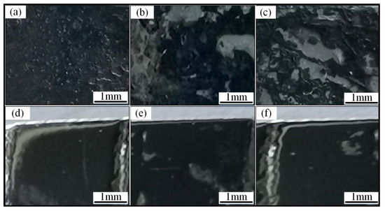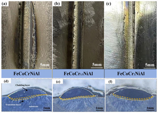 Macroscopic morphology of cladding layers with different Cr content. (a,d) x = 1; (b,e) x = 1.5; (c,f) x = 2.