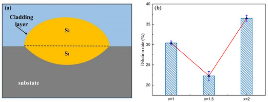 Dilution rate of cladding layer with different Cr content. (a) Simplified schematic diagram of cross-sectional profile; (b) column diagram of dilution rate.