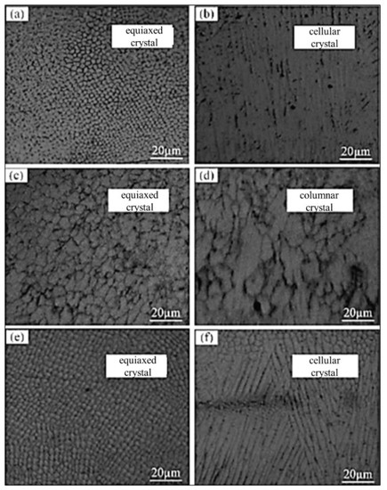 The effect of Cr content on the microstructure in different regions of cladding coatings is figured out in this research. Figure 7 shows the SEM morphology of the coatings with different Cr content. The upper and middle parts are equiaxed crystal mostly, while the position near the substrate is columnar or cellular crystal with directionality. The columnar crystal grows along the specific thermal diffusion direction, which is perpendicular to the interface from the substrate to the coating in the laser cladding process. As the cooling goes on, the temperature gradient becomes small and the preferential orientation of dendrite growth is not obvious, so it is more inclined to form equiaxed grains in the upper and middle regions.
