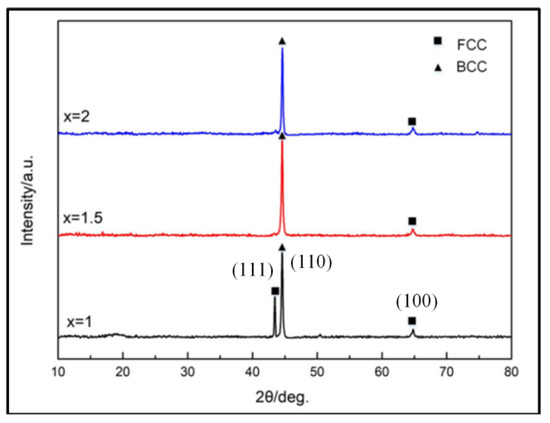 The XRD patterns of the coatings are illustrated in Figure 8, which shows that there are only simple FCC and BCC phase in the HEA coatings due to the high-entropy effect. When x = 1, there exist the diffraction peaks of both FCC and BCC phase. When x = 1.5 or 2, there are only two diffraction peaks of BCC phase, while FCC diffraction peak disappears. The intensity of BCC diffraction peak firstly increases and then decreases with the increase of Cr content in the powder, which is the same as the trend of actual Cr content in the coatings determined by XRD. It can be concluded that the existence of Cr promotes the formation of BCC phase. The BCC phase has low density and loose structure, which can change the lattice distortion and reduce the free energy of the high-entropy alloy system.