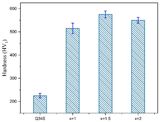The hardness diagram of Q345 welded joint and HEA coatings with different Cr content are illustrated in Figure 9, and the hardness of the HEA layers is higher than that of the Q345 welded joint obviously. Due to the interaction between the multi-principal elements that will promote the internal fine-grain strengthening, dispersion strengthening and solid solution strengthening of the alloy during the solidification process, the hardness of the HEA coatings is much higher than that of the Q345 substrate. With the increase of Cr content in the powder, the hardness of the layer increases first and then decreases. Combined with the XRD results, there exist both FCC and BCC phase when x = 1. As the Cr content continues to increase, there exist only a single BCC phase. FCC structure has many slip systems, which is easy to deform when subjected to external force, so the hardness of BCC phase is higher than that of FCC phase. When x = 1.5, the actual Cr content is the largest, so the microhardness is the highest. However, the actual Cr content is not much different, so the hardness changes little.