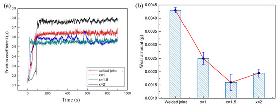 The wear resistance is determined by friction and wear test, and the friction coefficient, wear amount and wear morphology are compared and analyzed. Figure 10a is the curves of the relationship between friction coefficient and reciprocating motion time. Because the surface of the samples is ground and polished smoothly before test, the friction coefficients start from a small value and increase rapidly. Then the friction coefficients become stable with small fluctuations. However, the time entering the stable stage is slightly different, affected by the characteristics of the samples and the surface treatment before the experiment. When x = 1.5, the friction coefficient curve is located at the bottom with the smallest friction coefficient, showing that the hardness and wear resistance are proportional.