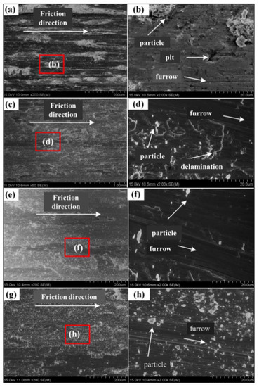 The wear morphologies of welded joint and cladding layers are illustrated in Figure 11. It can be seen from the figure that the surface wear of welded joint is serious. As is shown in Figure 11a,b, the surface is subjected to stress so that the surface metal is stripped, and pits are left in the process of friction and wear. At the same time, small metal particles will be produced and grind the surface in the process of reciprocating motion of the friction pair, leaving furrows on the welded surface. The wear mechanism of welded surface is composite wear composed of adhesive and abrasive wear. The wear surfaces of the cladding layers with different Cr content are smoother without obvious pits by contrast in Figure 11 from c to h, indicating that the wear resistance of the HEA cladding layer is better. When the Cr content is small, the furrows and metal particles on the worn surface are accompanied by delamination fracture, proving that the wear mechanism is abrasive and delamination wear. When x = 1.5, the furrow depth becomes shallow with small amount of the shedding metal particles. However, the wear surface is distributed with furrows and more shedding metal particles when x = 2, indicating the wear mechanism belongs to abrasive wear. With the increase of Cr content, the wear scar roughness decreases firstly and then increases, owning to the changing of actual Cr element content and microhardness. The increasing hardness improves the cutting resistance and then enhances the wear resistance of the cladding layer.