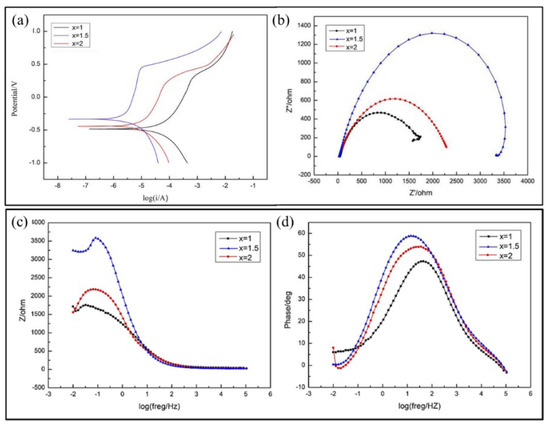 The Nyquist plots of layers are presented in Figure 12b, presenting capacitive arc characteristics, but the amplitude of different layers is different, that is, the size of the arc radius. When x = 1, the amplitude is the smallest. With the increase of Cr content, it increases firstly and then decreases, showing that when the corrosion reaction occurs, the electrode reaction resistance of the cladding layer with x = 1.5 is the largest making the corrosion reaction difficult. The results are consistent with the results of the polarization curves. Figure 12c,d is the Bode diagram of the cladding layers. Figure 12c shows that the impedance values appear the same trend as Nyquist plots. As is shown in Figure 12d, the phase angle is the largest when x = 1.5. Therefore, with the increase of actual Cr content, the corrosion resistance increases.