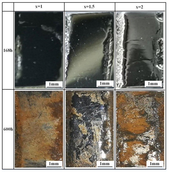 Macro morphologies of cladding layers with different Cr content in different corrosion time. In the figure, x = 1, x = 1.5 and x = 2 respectively represent the molar coefficients of Cr in the HEA coating. Additionally, 168 and 600 h respectively represent the time length of the corrosion experiment.