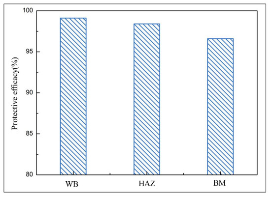 The electrochemical corrosion experiments of different regions of welded joint and coatings on them are carried out to investigate the protection efficiencies of the cladding layers on the WB, HAZ and BM. The calculation formula of protection efficiencies (PE) is as follows: