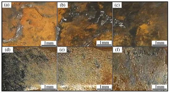 Surface morphologies of welded joint and HEA layers after 600 h corrosion: (a) welded bead; (b) heat-affected zone; (c) base metal; (d) cladding layer on WB; (e) cladding layer on HAZ; (f) cladding layer on BM.