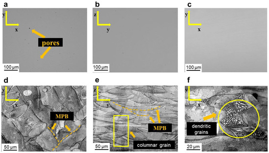 OM images of as-built Hastelloy X (HX) sample: (a) pores in the samples before parameter optimization (as marked by yellow arrows); (b,c) near fully dense after parameter optimization along the y-z and x-y planes; (d,e) the melt pool boundaries (MPB) along the x-y and z-y planes; (f) cellular and columnar shapes of dendritic with molten pools.