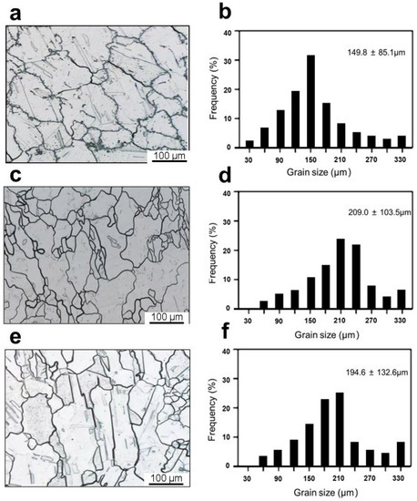 Representative optical microscopy images of (a) 1175-FC sample, (c) 1175-AC sample, and (e) 1175-WQ sample. The equiaxed grain boundaries in (a,c,e) are traced by black-color lines. The histograms of equiaxed grains size are shown in (b,d,f).