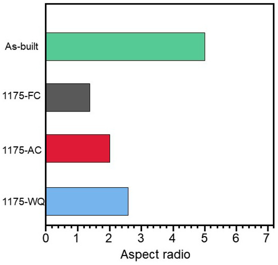 Calculated grain aspect ratio for samples in different states: as-built, 1175-FC, 1175-AC, and 1175-WQ.