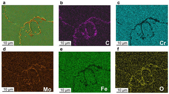 The chemical compositions of carbides after furnace cooling were further characterized by energy dispersive spectroscopy (EDS), as shown in Figure 6. For FC samples, EDS measurement reveals that the element of carbon was marked in Figure 6b, and the content percentage was 14.19%. Besides, the composition of other chemical elements was 41.06 at.% Cr, 8.96 at.% Fe, 14.99 at.% Mo, 3.36 at.% O, and 2.02 at.% of all other remaining elements (as seen in Table 3). According to chemical composition, the EDS analysis shows the continuous presence of Cr-rich M23C6 carbides along the grain boundaries, after furnace cooling [43].