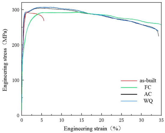 High temperature (855 °C) tensile stress-strain curves of the as-built sample (marked by red solid line), furnace cooling (FC) sample (marked by green solid line), air cooling (AC) sample (marked by black solid line) and water quenching (WQ) sample (marked by blue solid lines).