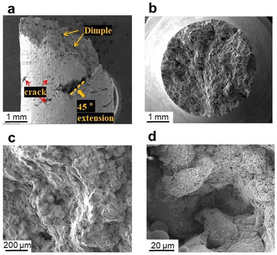 Fracture surface characterization of tensile failed 1175-FC samples by using SEM: (a) the side surface of the fracture; (b) the front view of the fracture sample; (c,d) the morphology of fracture surface under different magnifications.